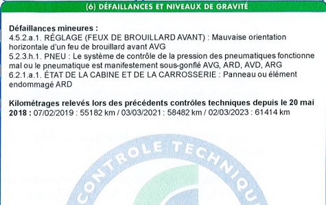 Les résultats du contrôle technique, y compris les défauts majeurs et les contre-visites, apparaissent dans le rapport Histovec.