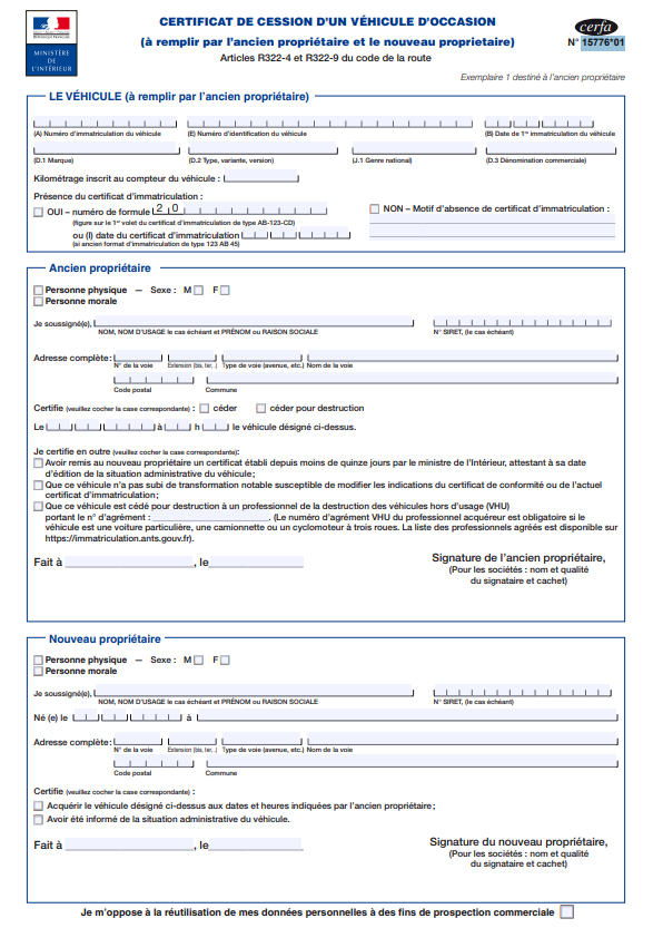 1 certificat de cession – Cerfa n°15776*01